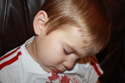 As a mom I am a firm believer in choosing my battles. Nap time lately with Lincoln has been a battle and a half especially since he can get out of his bed and open the door and ask for his millionth hug of the day...cute and sweet I know but he'll do this for an hour and when you put him back in his room he cries which in turns wakes up baby Nate. Yesterday was a nap battle I didn't care to win so after an hour of him coming out every couple of minutes for hugs and kisses I gave up and told him he could come have some cuddles on the couch with me. He really insisted he wasn't tired and didn't want to nap...so 2 minutes later this is what I looked over to see:-) Really he wasn't tired...he told me so!