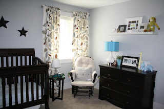 What a difference a coat of paint can make. Nates room finally looks complete and I love it! I had 2 silver picture frames on Nate's wall and they never looked just right-I didn't know if it was the frames or the matting and it always kinda bothered me. Every time I went into his room I had that thought "What about these frames doesn't look right?" Now the picture frames look perfect on his wall. The color also goes really well with his curtains. It feels so good knowing Nates room is complete. I can check that room off my to do list.